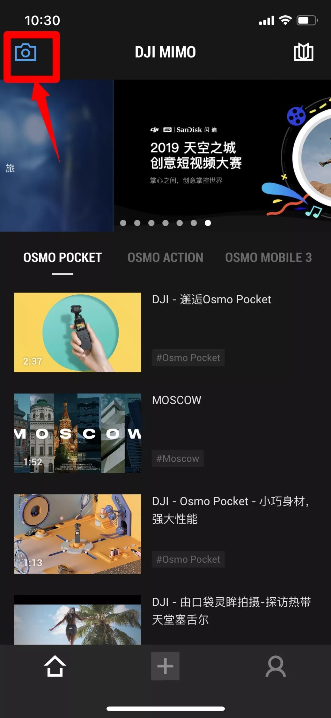 首先,在调平工作完成之后将机器开机,并打开手机蓝牙。进入DJI MIMO app界面,系统提示发现osmo设备,左上角的相机标志变为蓝色,单击标志即可进入拍摄界面。再单击左上角房子图标可回到初始界面。