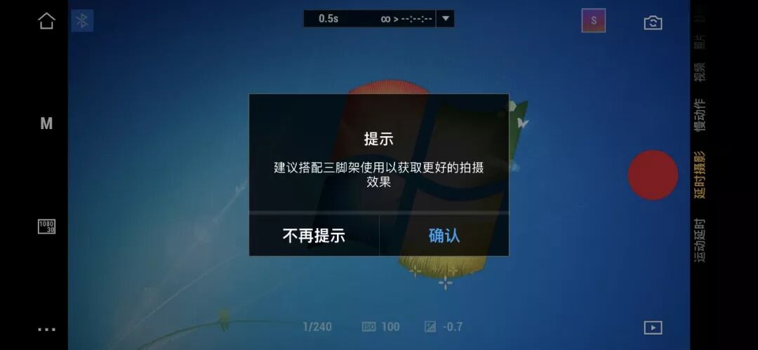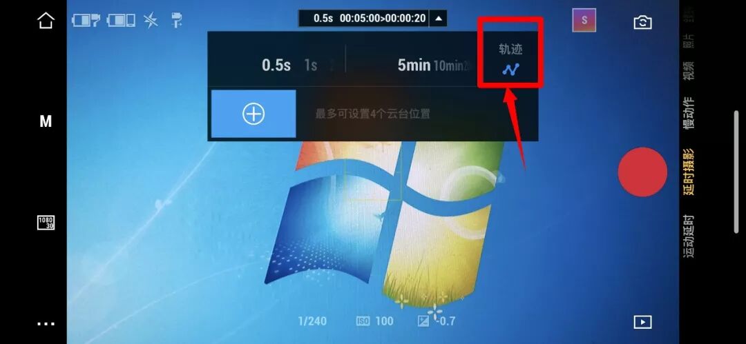 延时摄影模式建议搭配三脚架使用,屏幕上方有可以调节拍照间隔时间和时长的选项,也可以选择记录云台位置拍摄视角缓慢变化的延时摄影