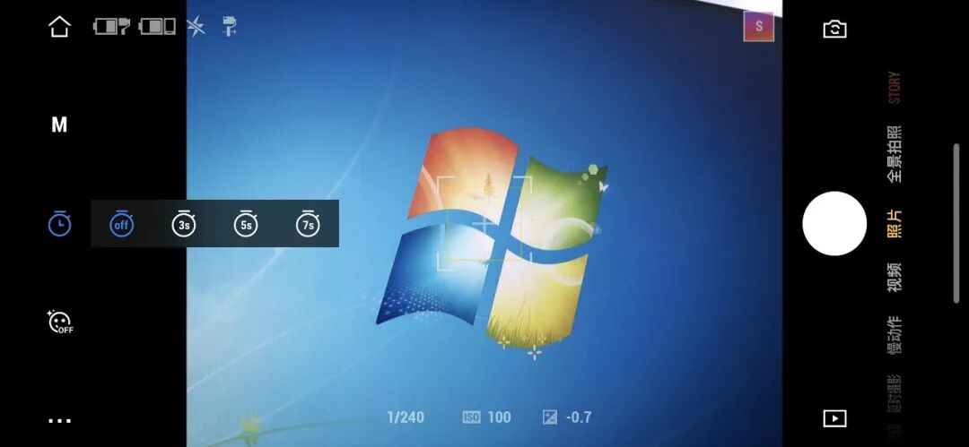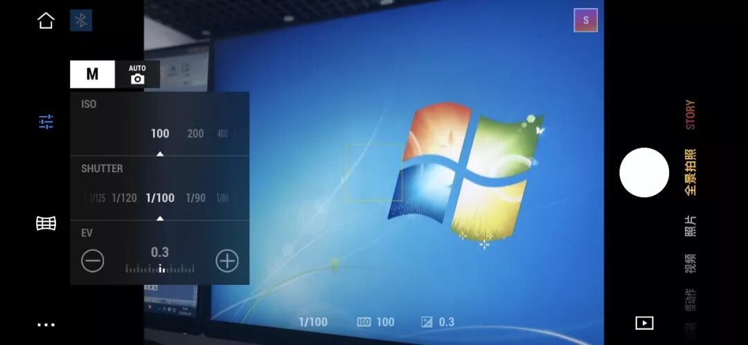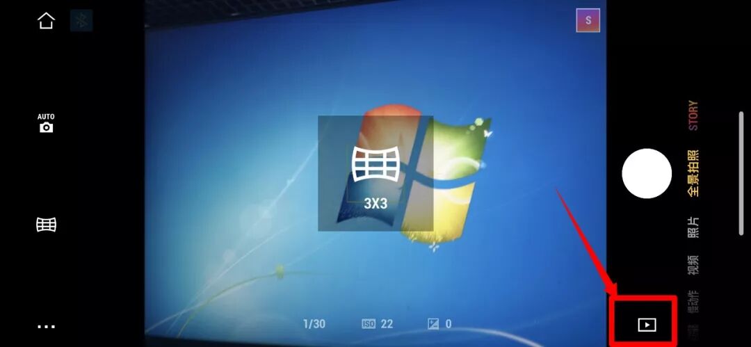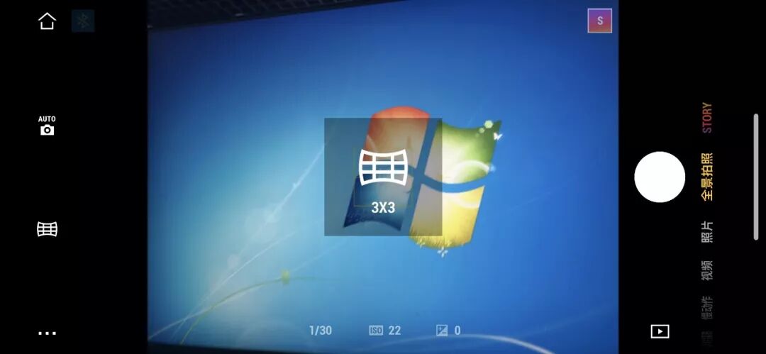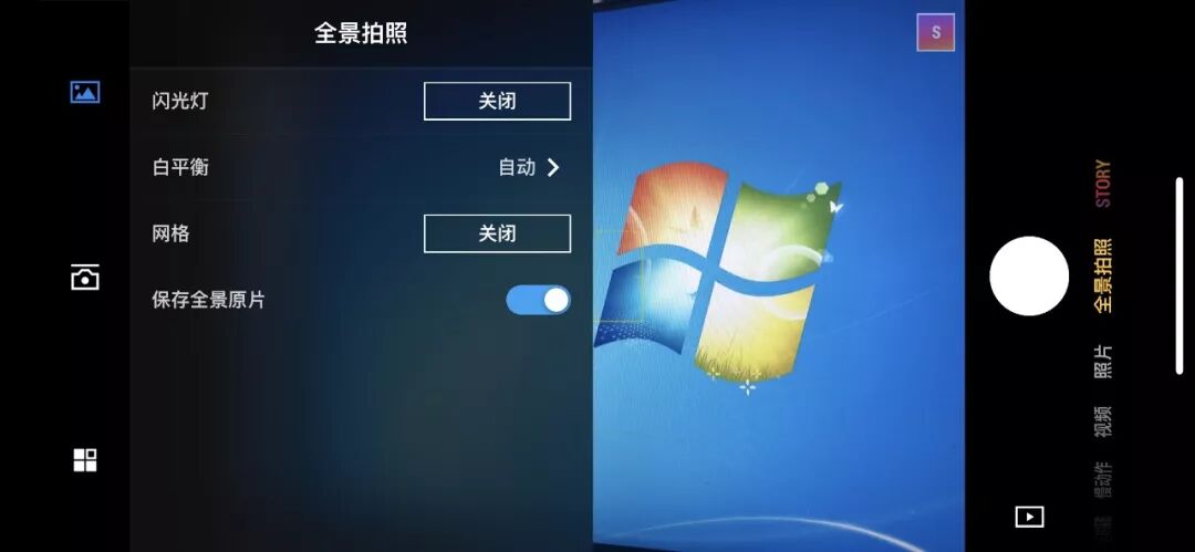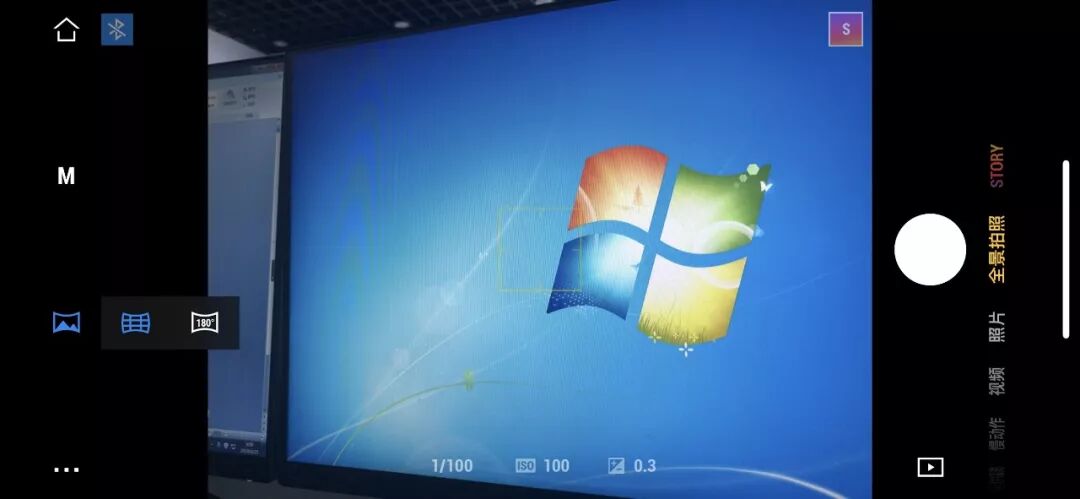 下一个模式是全景拍照模式。通过左边的设置按钮可以分别调节相机的参数,闪光灯等。也可以切换180度全景和3*3全景模式,系统会根据您选择的模式自动拍摄照片并合成。(因为对着电脑拍摄,所以图中出现win系统图标)