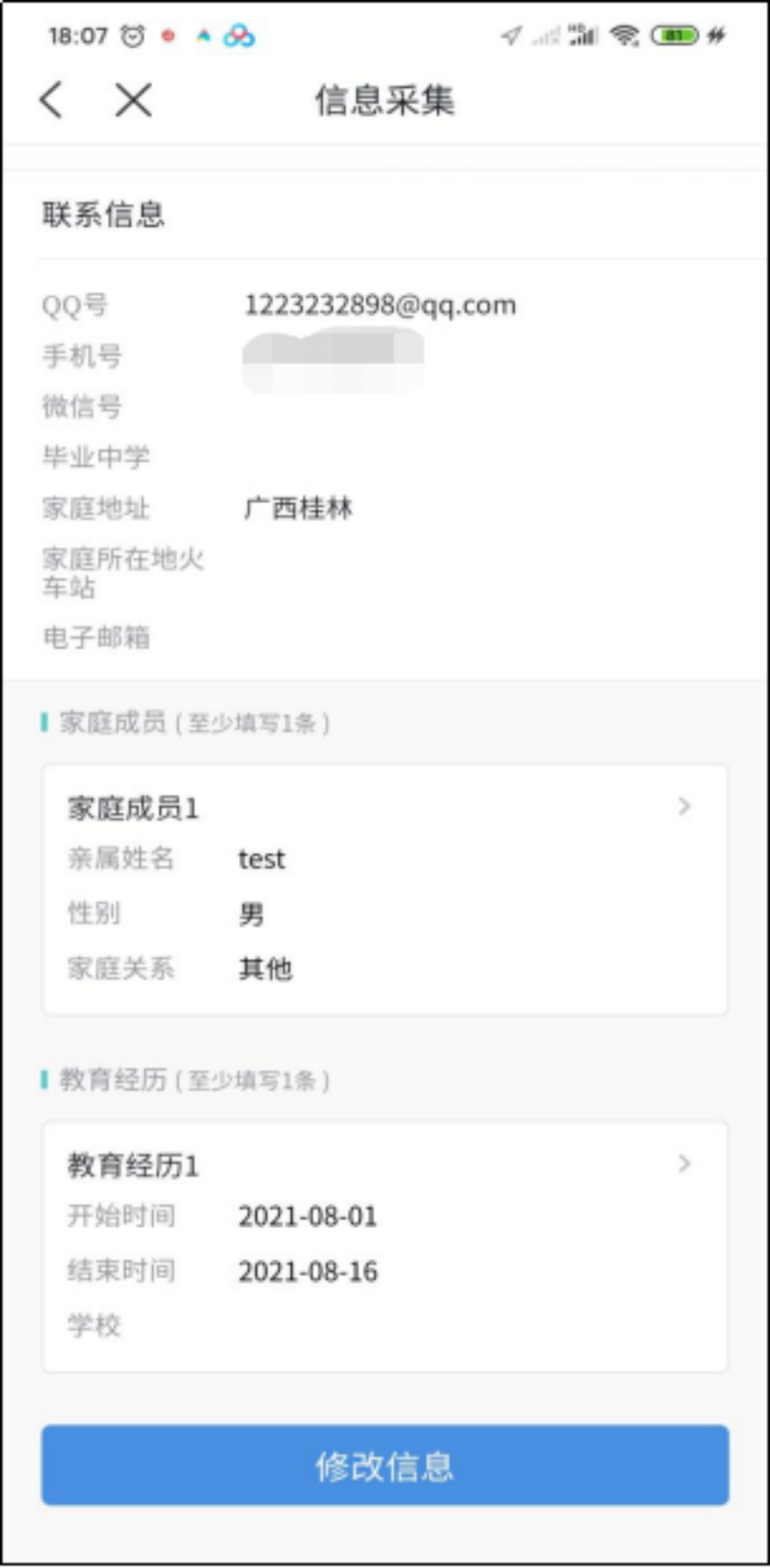 新生报到前填写个人信息,以备学校留档查看。各项数据资料将用于新生入学报到时所用,请务必认真填写。如图点击页面最下方红框部分的“修改信息”对基本信息进行编辑,填写好所有信息后,点击页面最下方【提交】按钮。