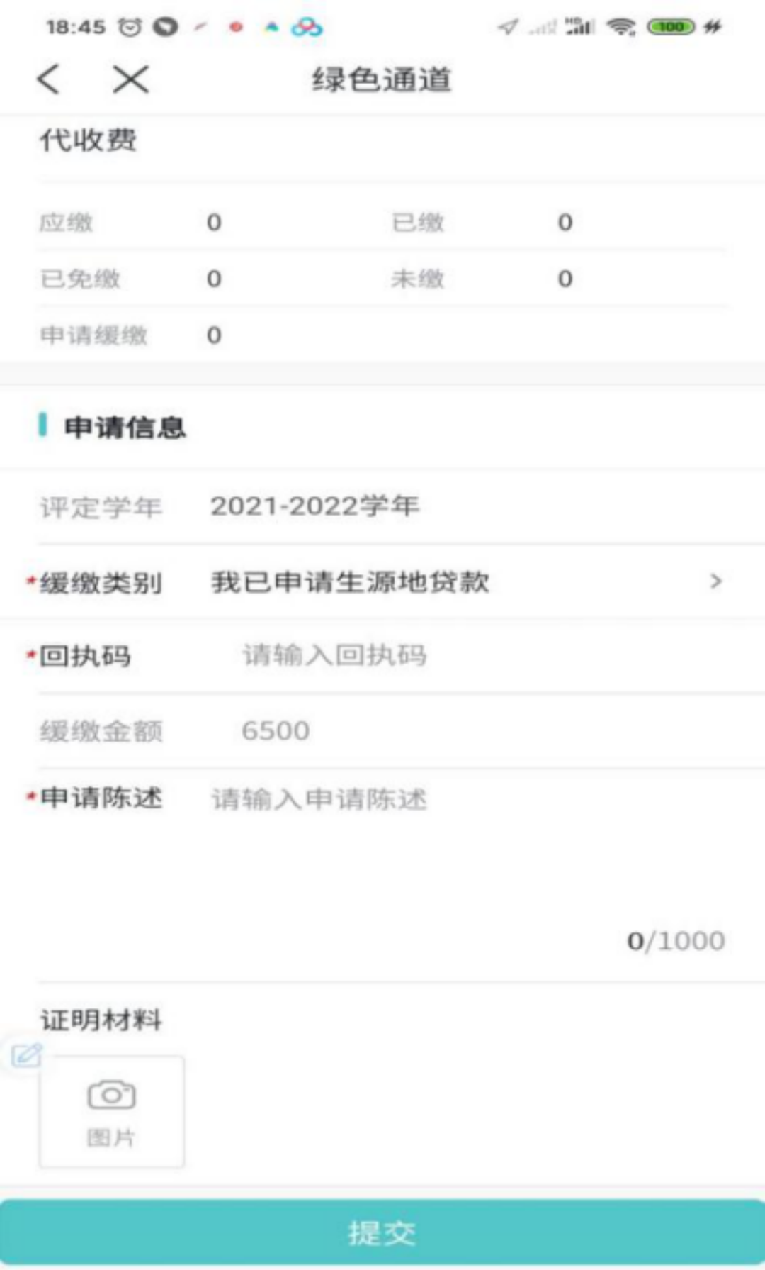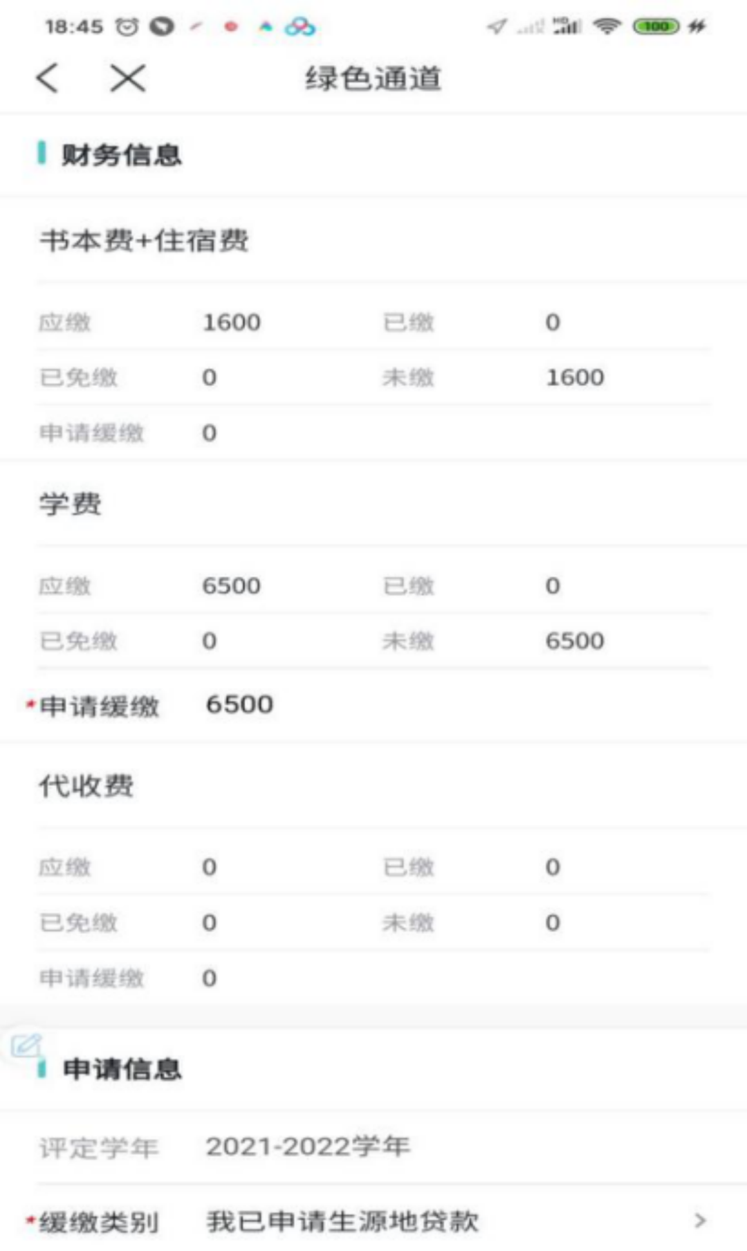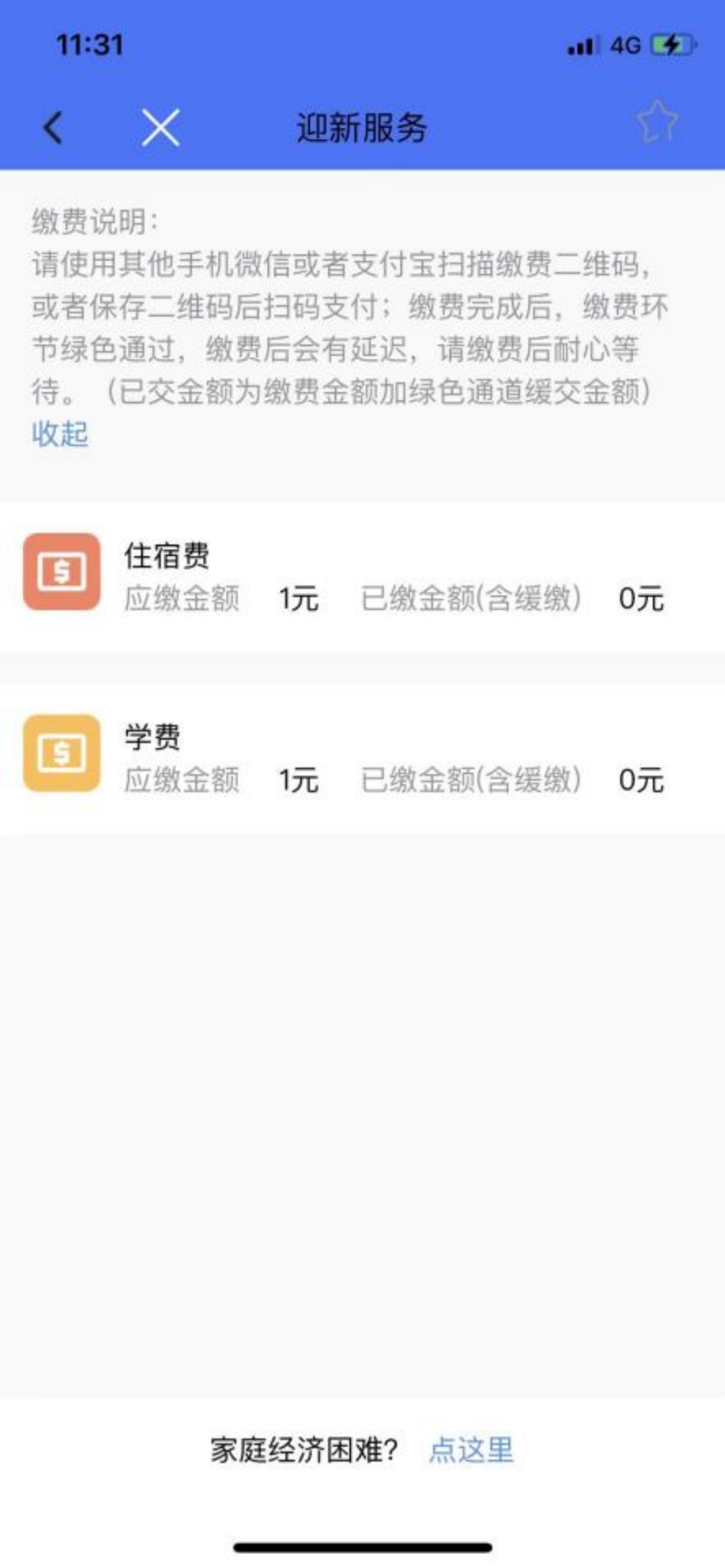 (1)若家庭经济困难(即申请生源地助学贷款或高校助学贷款),点击下方被圈按钮,可直接进行绿色通道申请。申请通过后及时查看扣费情况,若“已缴金额”后出现相应数字,则说明缴费成功。