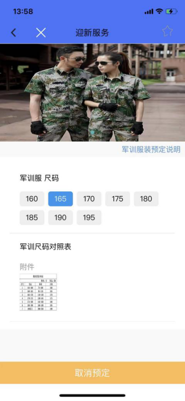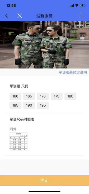 (1) 在迎新服务界面,点击“军训服装”,进入军训服装选择界面,选择合适的尺码,点击预定。