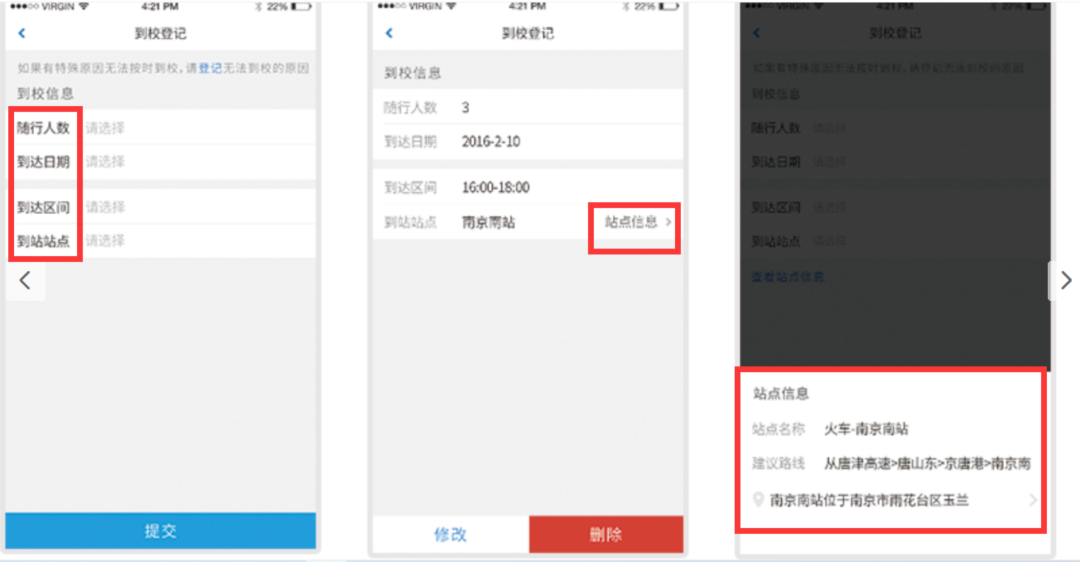 (1)如下图,点击“到站登记”,进入登记界面填写到校信息。如随行人数、到达日期、到达时间、到达站点。