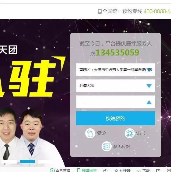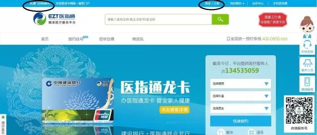 进入天津中医药大学第一附属医院官网后,在网站的左上方(如下图所示)您可以找到“网上预约挂号”,点击一下就可进入医指通;当然您也可以直接输入网址“http://www.eztcn.com/”也可以直接进入该网站。