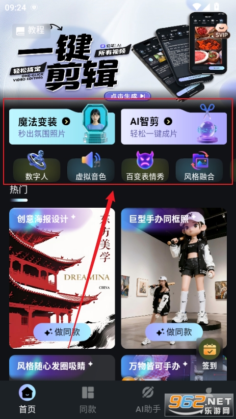 1、进入软件可以看到有魔法便装,ai智剪等功能