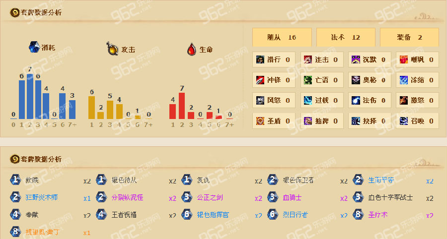 卡组思路:以公正之剑为导火线为圣盾仆从上BUFF,占场、打脸、解怪任你喜欢,然后上大BOSS血骑士(每吸收一个圣盾增加3/3的属性,对于这组套牌而言非常的IMBA)血骑士在这套牌中就相当于黄金12宫中的潵伽,扒衣狂魔。