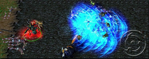 [ 《澄海3C》终结天鬼流 ]此技能可以穿树(如图)、穿墙 (见后面15、20下紫演示)、减速。虽然不能打魔免,但对魔免和无敌单位或英雄都能减速。