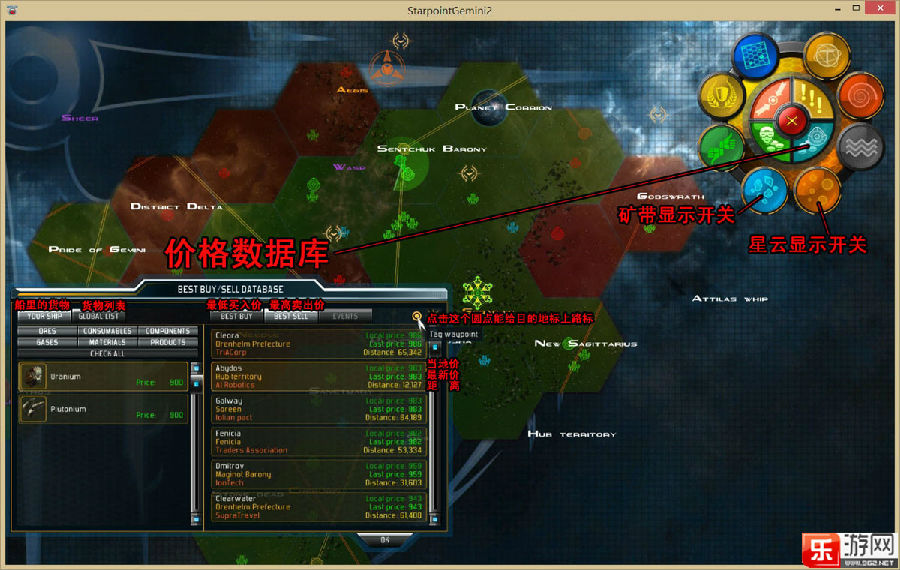 打开地图后,可以点击右上角的价格数据库,可以让你查询查矿价. 点Best Sell可以查到你船舱内矿物在哪里卖得最好,然后点列表右上的圆点就能在星图上标上路标. 这也是跑商的方法。