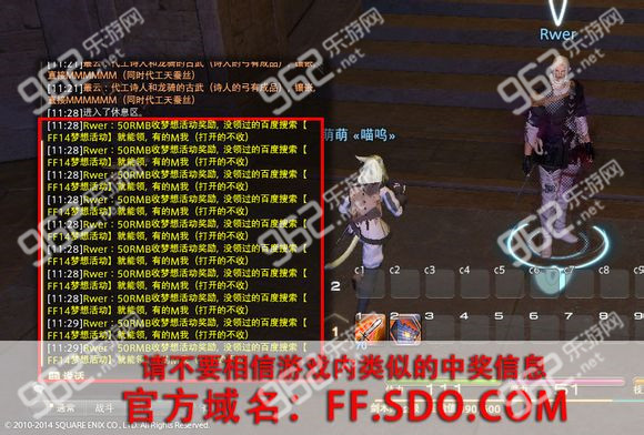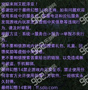 《最终幻想14》开放性测试现已火爆开启!冒险者们,握紧手中的剑,擦亮积尘已久的铠甲,聆听水晶的召唤,即刻进入艾欧泽亚,与战友们一起开始新的征程! 近期,游戏中出现了大量不法分子,恶意刷屏、密语或发放邮件,以免费发放礼包等虚假中奖信息为饵,诱导冒险者进入钓鱼网站,从而盗取了冒险者们的账号密码。运营组在此强调, 请冒险者们不要相信游戏内任何的搜索礼包、礼盒、回馈奖励等虚假中奖信息,更不要相信搜索答案给出的链接,以免造成帐号被盗、手机解绑!