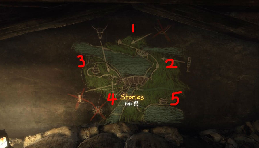 然后沿路前进,过大坝,过大坝之后,会发现有两个房子,这里有一个谜题,你先到红顶房子里面看一下,记住里面各个房间的相互关系。然后到灰顶房子里面,看桌上的纸,可以触发谜题,就是让你还原成红顶房子的布局。不行自己画一下平面图,记一下各个房间特有的物品。破解谜题后,你会到达隐藏的房间,并得到故事。然后在红房子后面的森林里,找到女巫的营地,得到小故事。