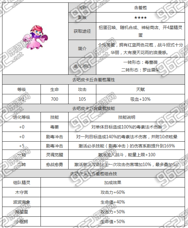 去吧皮卡丘带我们重温童年经典,今天小编为大家介绍含羞苞的全面的属性,希望玩家在使用该精灵的时候得心应手,在游戏中打出最大化伤害!