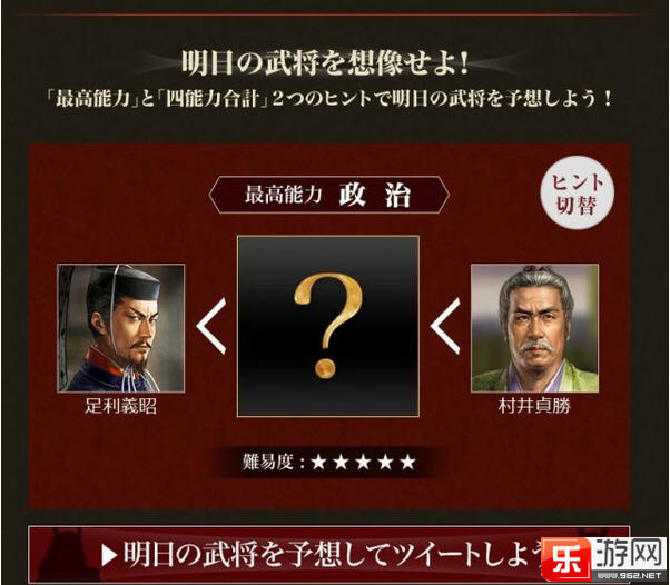 明天的武将将会是谁呢?根据“最高能力”和“四项能力总和”2个线索大家试着来猜猜看吧。