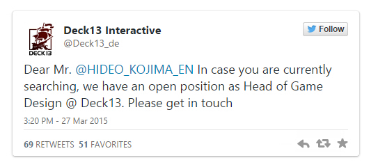 《堕落之王》开发商Deck 13在推特上写道,如果小岛秀夫现在在寻求工作,Deck 13这里提供游戏设计负责人的职位,希望保持联系。