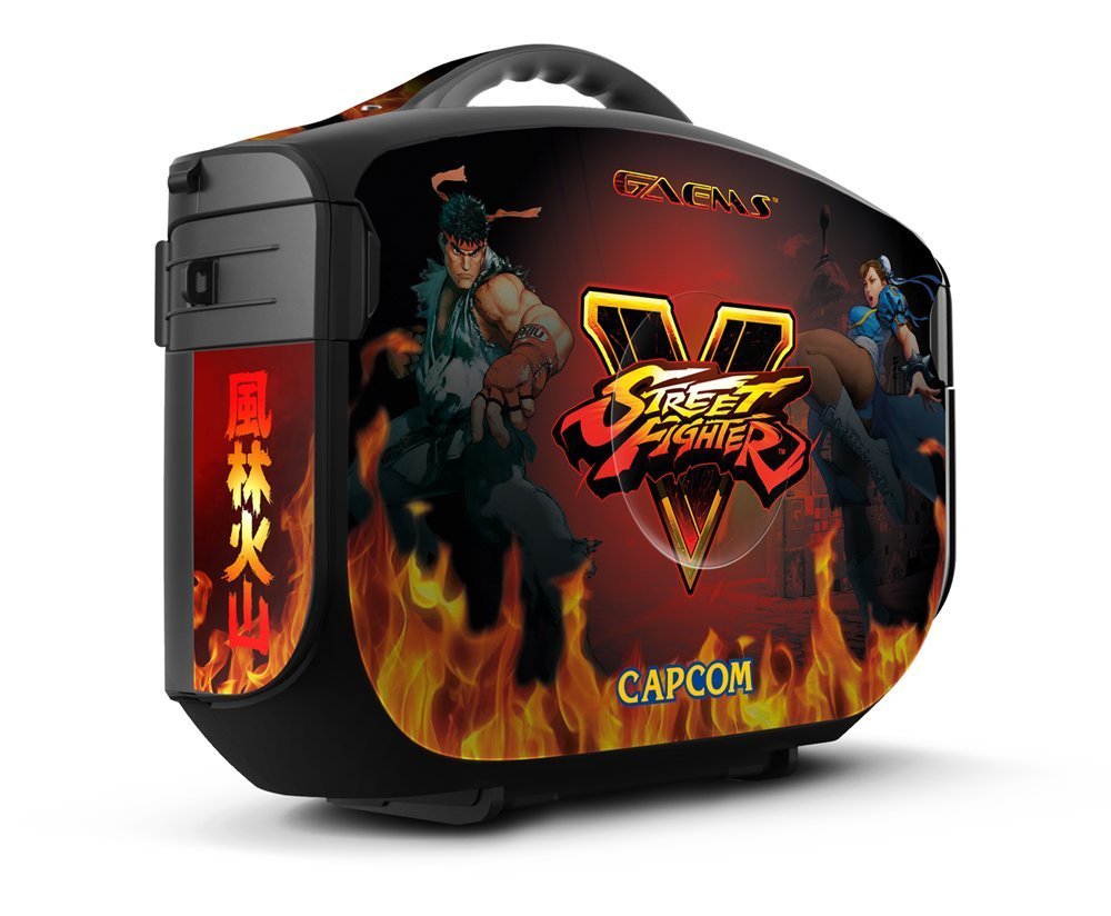 Vanguard Personal Gaming Entertainment System是GAEMS公司出品的一个主机便携包,里面配有显示屏,你可以把你的主机和配件们装在盒子中,拎着去任意别的地方玩。目前PS4主机版的便携包已经出了普通的黑色版和蝙蝠侠合作版,现在它又出了一款《街霸5》合作版。