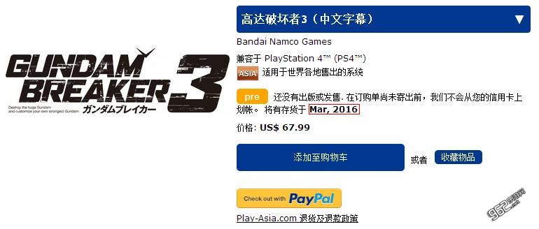 在Play-Asia的商品介绍页面中,小编发现《高达破坏者3》繁中版已经上架,并且入货日期为2016年3月。