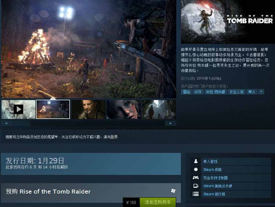我们知道《古墓丽影:崛起(Rise of the Tomb Raider)》PC版将在1月28日上市,现在本作正式在Steam人民币商店登陆,我们看到游戏售价160元人民币。