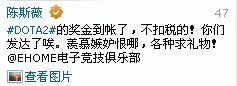 Ehome前产品部经理陈斯薇在微博透漏,Ehome DOTA2表演赛的奖金已经到账,而且并没有之前人们所说的高额的所得税。