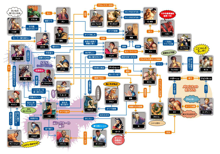 Fami通现在为我们制作出了《超级街霸4》全部出场人物的关系图,也许各位并不懂日文,但依然可以瞧个大概,起码可以知道谁和谁有关系,谁和谁八竿子打不着。