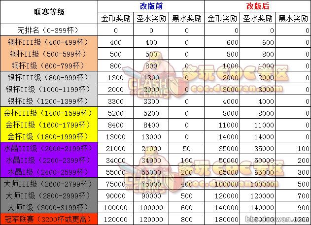 今天部落冲突更新了新的版本,除了新的武器道具之外,联赛奖励也有了更新,下面看看更新前后奖励对比吧。