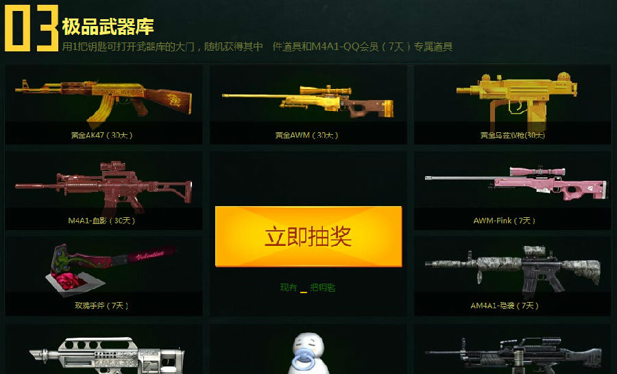 用钥匙可打开武器库的大门,随机获得其中一件道具和M4A1-QQ会员(7天)专属道具;