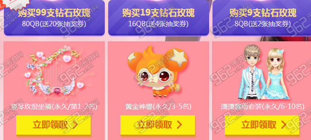 2玩家在本页面购买一定数量的钻石玫瑰,可获得【真爱抽奖区】抽奖券,一次性购买【99支钻石玫瑰】赠送【20张抽奖券】,一次性购买【19支钻石玫瑰】赠送【4张抽奖券】,一次性购买【9支钻石玫瑰】赠送【2张抽奖券】,多买多送哦~