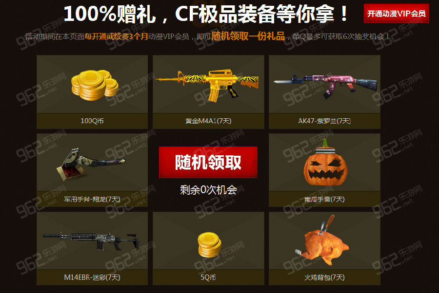 2.开通动漫VIP送CF礼包,单礼包单Q限领1次,礼品数量有限,先领先得