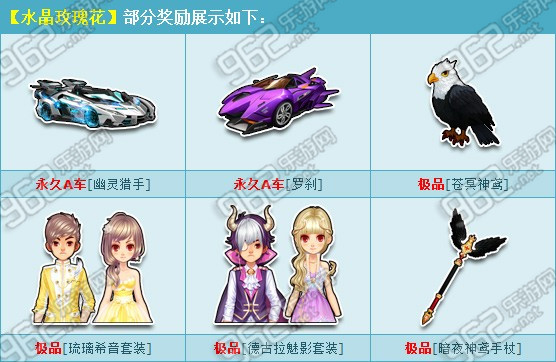 11月26日-1月12日,在商城购买“水晶玫瑰花”,开启就有机会获得永久特效A车幽灵猎手、永久大喷口A车罗刹、极品宠苍冥神鸢或其他奖励之一。