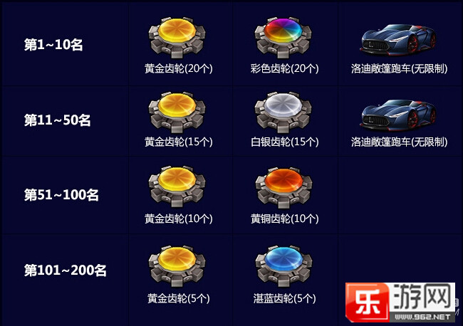 总排名1-10名获得的是黄金齿轮20个、彩色齿轮10个,洛迪敞篷跑车一辆