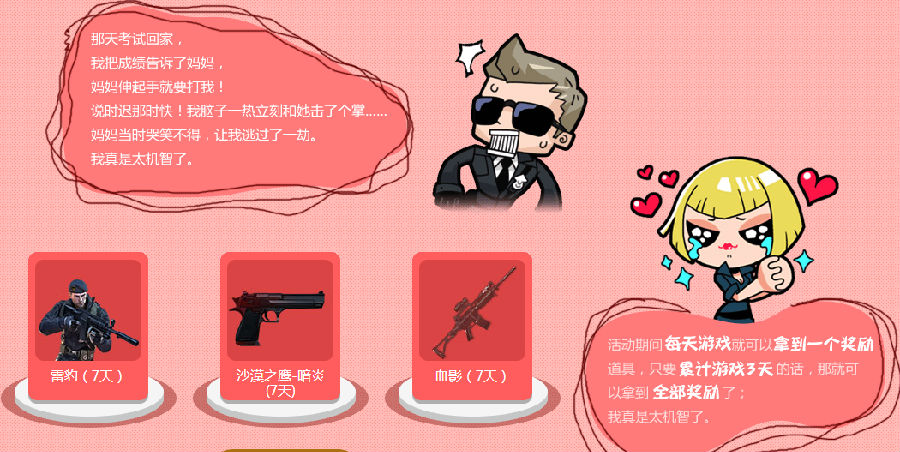 1活动期间,每天在爆破,团队竞技中获得一局胜利或者在生化模式中游戏三局即算完成当天挑战任务,可获得一次极品武器抽奖机会;