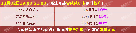 12月02日19点-21点,魔法套装合成成功率限时提升!