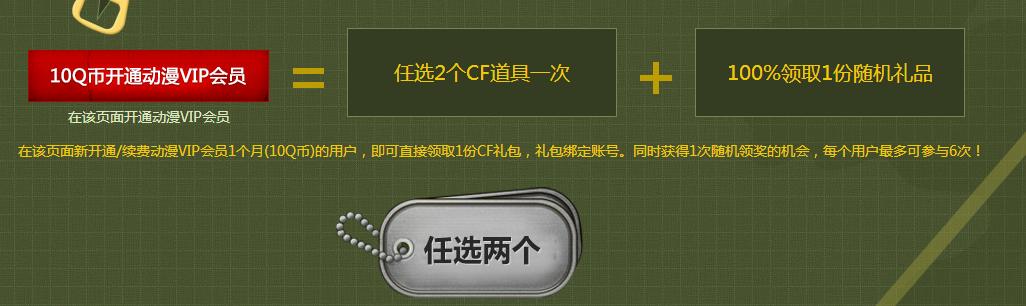 在该页面新开通/续费动漫VIP会员1个月(10Q币)的用户,即可直接领取1份CF礼包,礼包绑定账号。同时获得1次随机领奖的机会,每个用户最多可参与6次