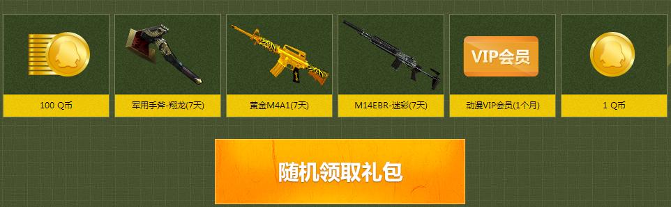 100 Q币军用手斧-翔龙(7天) 军用手斧-翔龙(7天)黄金M4A1(7天) 黄金M4A1(7天)M14EBR-迷彩(7天) M14EBR-迷彩(7天)动漫VIP会员(1个月) 动漫VIP会员(1个月)1 Q币 1 Q币。