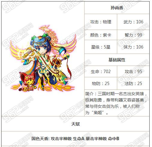 今天小编为各位介绍下暴打蜀魏吴中孙尚香的属性,孙尚香在三国中是一个文武双全的女人,下面就是小编为大家带来孙尚香在暴打蜀魏吴手游中的属性图鉴!