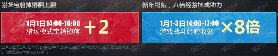 12月24日至1月3日 每天14点-16点及20点-22点全猎场模式的BOSS宝箱掉落增加,每次可获得闯关宝箱数量额外+1