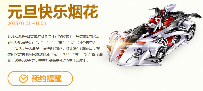 今天是2014年最后一天,在即将到来的2015年,QQ飞车放出了新的元旦快乐烟花活动,玩家可以通过收集元旦快乐烟花获得永久A车流星,不要错过哦。