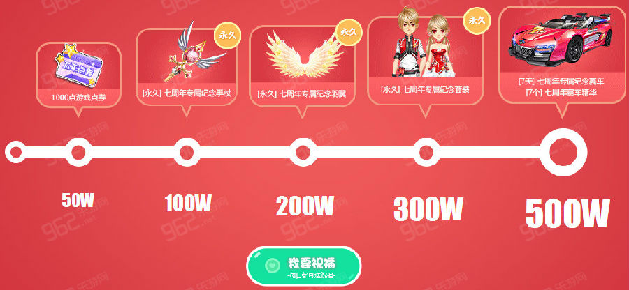 送祝福玩家数达到500万,所有玩家1月24日登录游戏可查看任务领取7天【七周年专属纪念赛车】(A车)+7个【七周年赛车精华】.