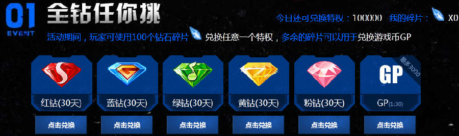 活动期间,玩家可使用100个钻石碎片兑换任意一个特权,多余的碎片可以用于兑换游戏币GP