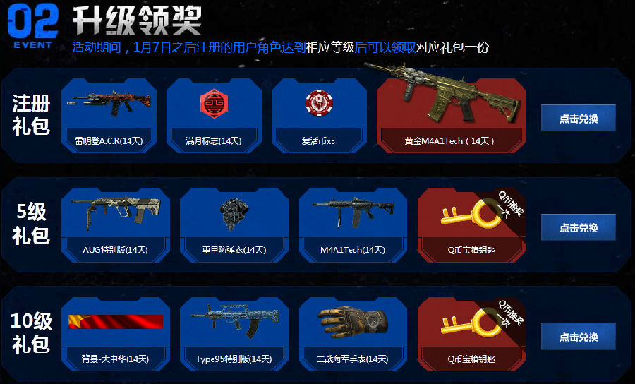活动期间,1月7日之后注册的用户角色达到相应等级后可以领取对应礼包一份