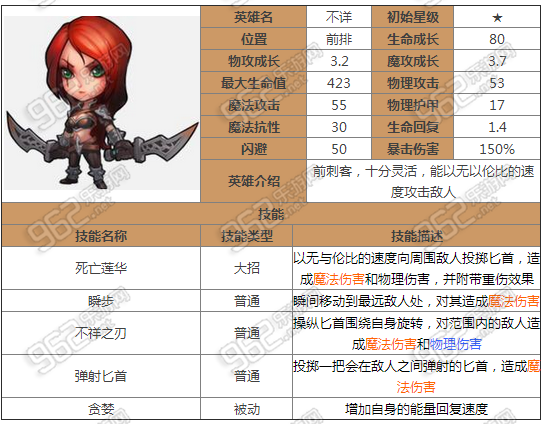 不详是前排英雄,属于输出类型,比较脆皮,没控制,站位是一个硬伤 。但是进阶到紫后四三技能的配合伤害非常恐怖,惧怕大虫子,怕一波技能没用出来就死了,推荐玩家配有治疗系的英雄,到后期不详也是输出主力之一。