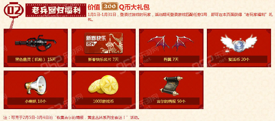 1月1日-1月31日,登录过游戏的玩家,活动期间登录游戏匹配任意1局,即可在本页面获得“老玩家福利”礼包。