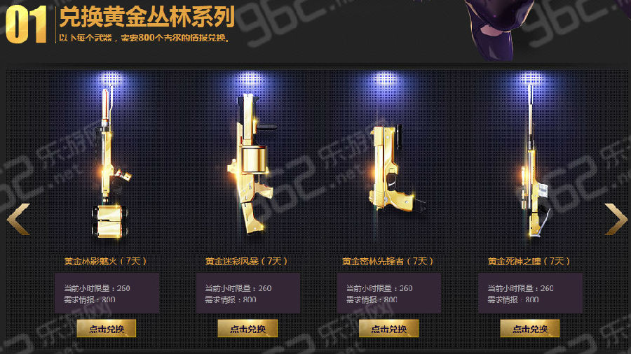 2、活动期间,玩家可以使用一定数量的情报来兑换奖励,每种奖励每个QQ号最多只能兑换5次;黄金丛林系列极品每日限量兑换,每个限量道具每人每天只能兑换1次;