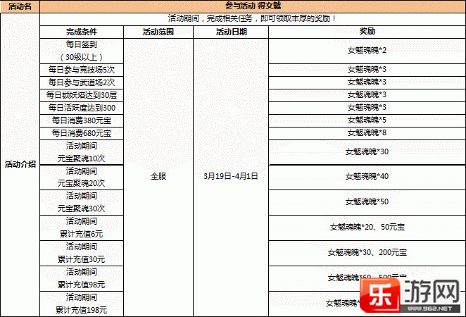 [乐游网导读]天下HD在今日3月19日早间进行了两个小时的停机更新,这次更新为我们带来了新元魂女魃,同时还上线了一些活动,下面就是小编为大家带来的全部活动内容!