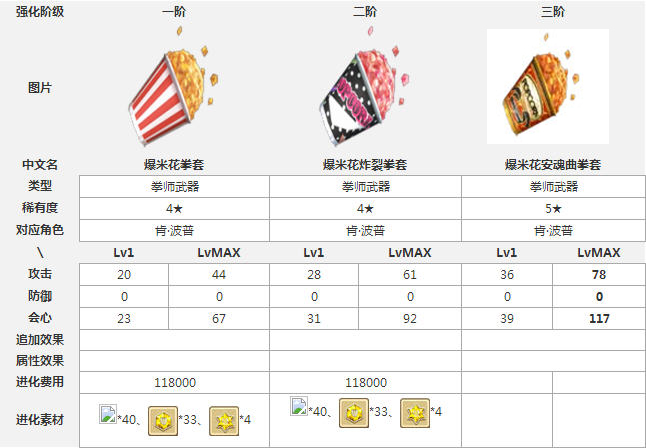 白猫计划中角色与武器都非常丰富,今天给大家介绍4星格斗家武器‘爆米花拳套’的详细属性以及进阶所需材料!同时也是玉米 肯·波普的专属武器!