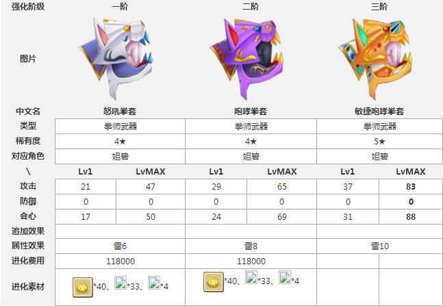 白猫计划中角色与武器都非常丰富,今天给大家介绍4星格斗家武器‘怒吼拳套’的详细属性以及进阶所需材料!同时也是半兽人少女妲碧的专属武器!