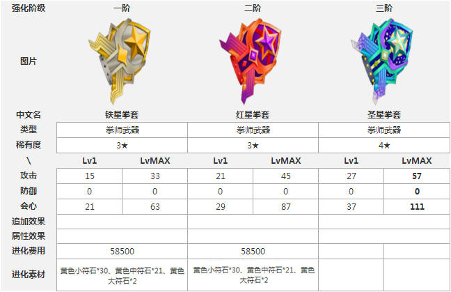 白猫计划中角色与武器都非常丰富,除了强大的4星以外3星武器也可一战!今天给大家介绍3星格斗家武器‘铁星拳套’的详细属性以及进阶所需材料!