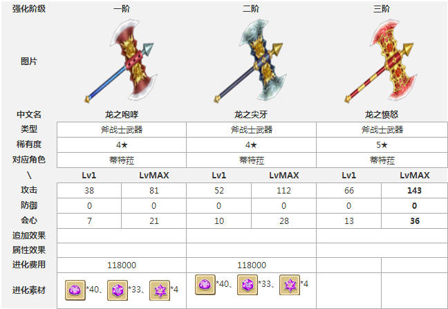 白猫计划中角色与武器都非常丰富,今天给大家介绍4星斧战士武器‘龙之咆哮’的详细属性以及进阶所需材料!同时它也是龙女的专属武器!
