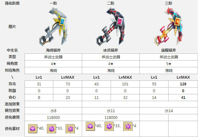 [乐游网导读]白猫计划中角色与武器都非常丰富,今天给大家介绍4星斧战士武器‘海鸥锚斧’的详细属性以及进阶所需材料!同时它也是海鸥的专属武器!