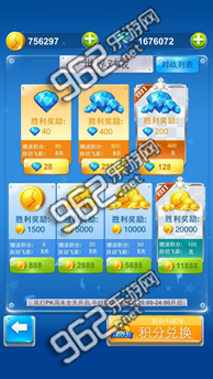 双打PK模式入场选择与以往的PK一样,分别有金币场和钻石场提供选择,玩家只需花费一定的金币或钻石入场,取得胜利后即可获得高额的金币或钻石奖励,价值接近入场费的2倍。同时无论胜败都有大量的积分赠送,让你赚得盆满钵满,别忘了在积分商城兑换好东西哦!