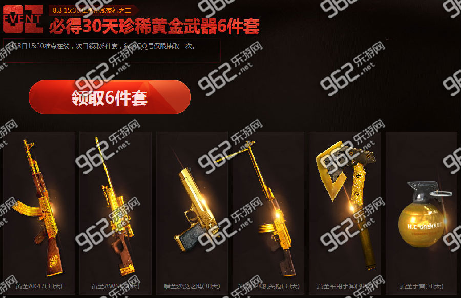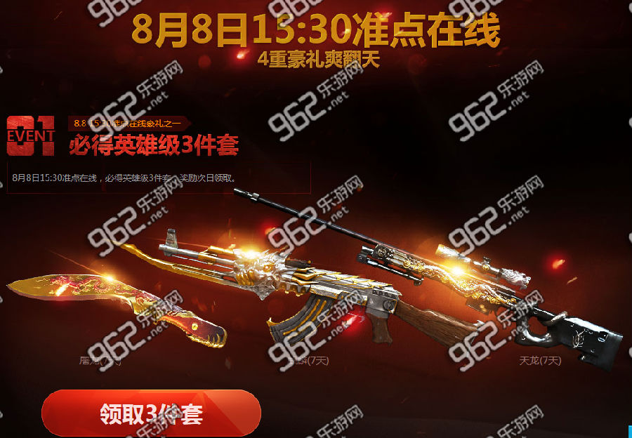 [乐游网导读]最近CF8月8日的在线活动奖励曝光,这次玩家可以通过预约在线领取到丰厚的黄金及英雄武器奖励,当然永久黄金依旧需要看人品,下面是活动奖励及预约地址分享。