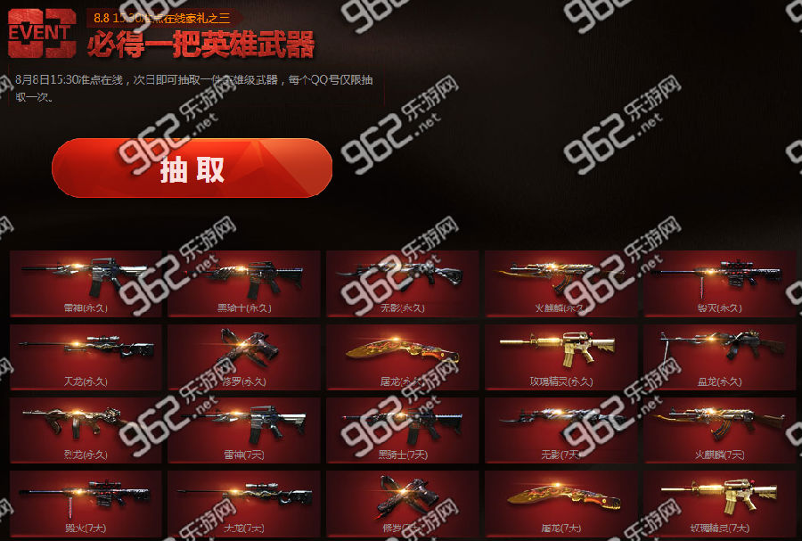 8月8日15:30准点在线,次日即可选择两个黄金宝箱打开,每个宝箱内含7天、30天、永久期限道具随机获得,每个QQ号仅限抽取一次。